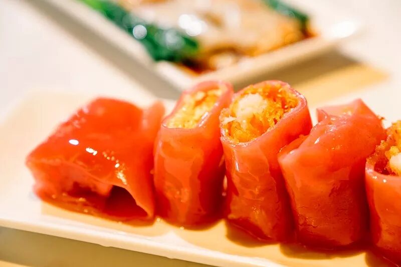 绯红油亮的红米肠粉,包裹着虾肉和金网,肠粉滑嫩,金网薄碎香脆。