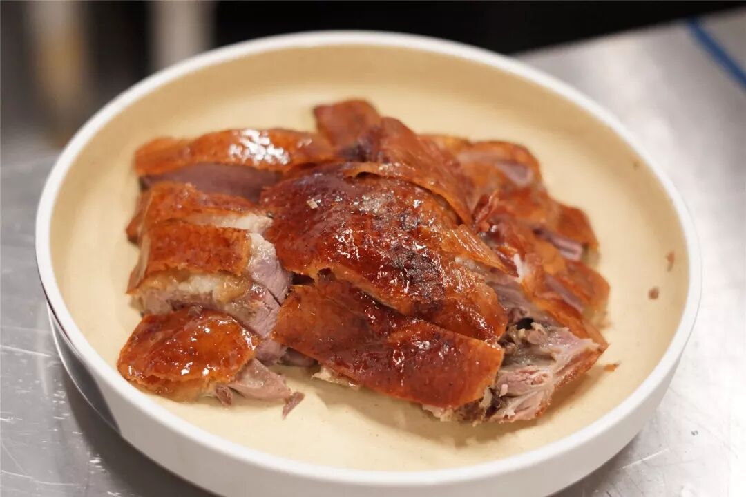 烧制完成的深井烧鹅透着金黄色,烧鹅皮酥脆松化,皮下带着一层雪白透亮的油脂。好吃的烧鹅,其表皮一定要有松化感,咬下去酥松可口,鹅肉入味有嚼劲、皮脆肉香。